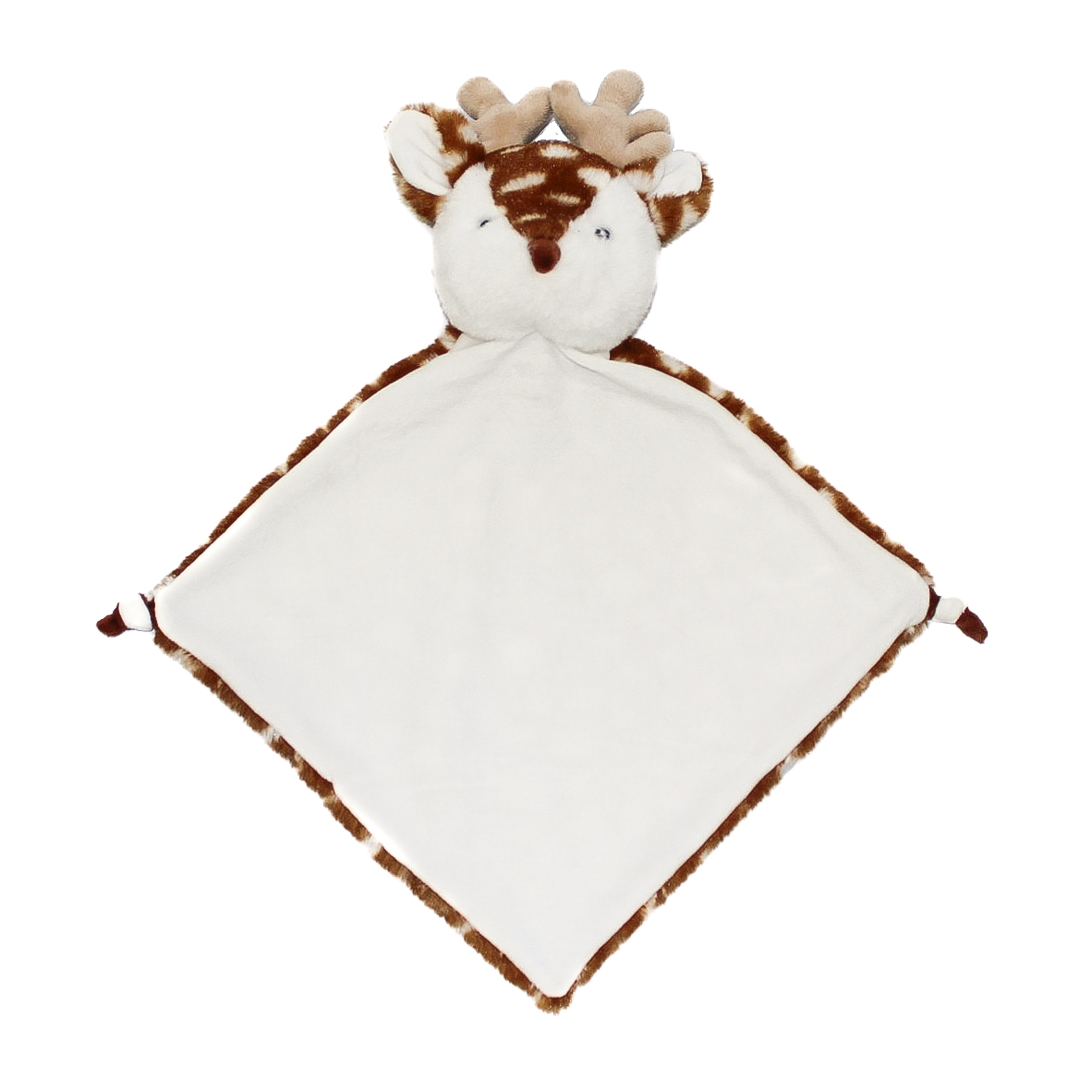 Snowflake has a brown body with white spots, snuggly fur, antlers and big black eyes.
